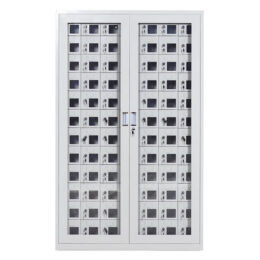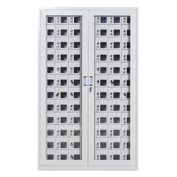 Casillas colgantes 100 puertas con visor acrílico más puerta exterior con vidrio templado.  Fabricada en Acero 0.5mm laminado con pintura termoesmaltada color gris estándar, orientada a la custodia de artículos personales pequeños. Posee cerradura con llave escritorio para mayor seguridad.