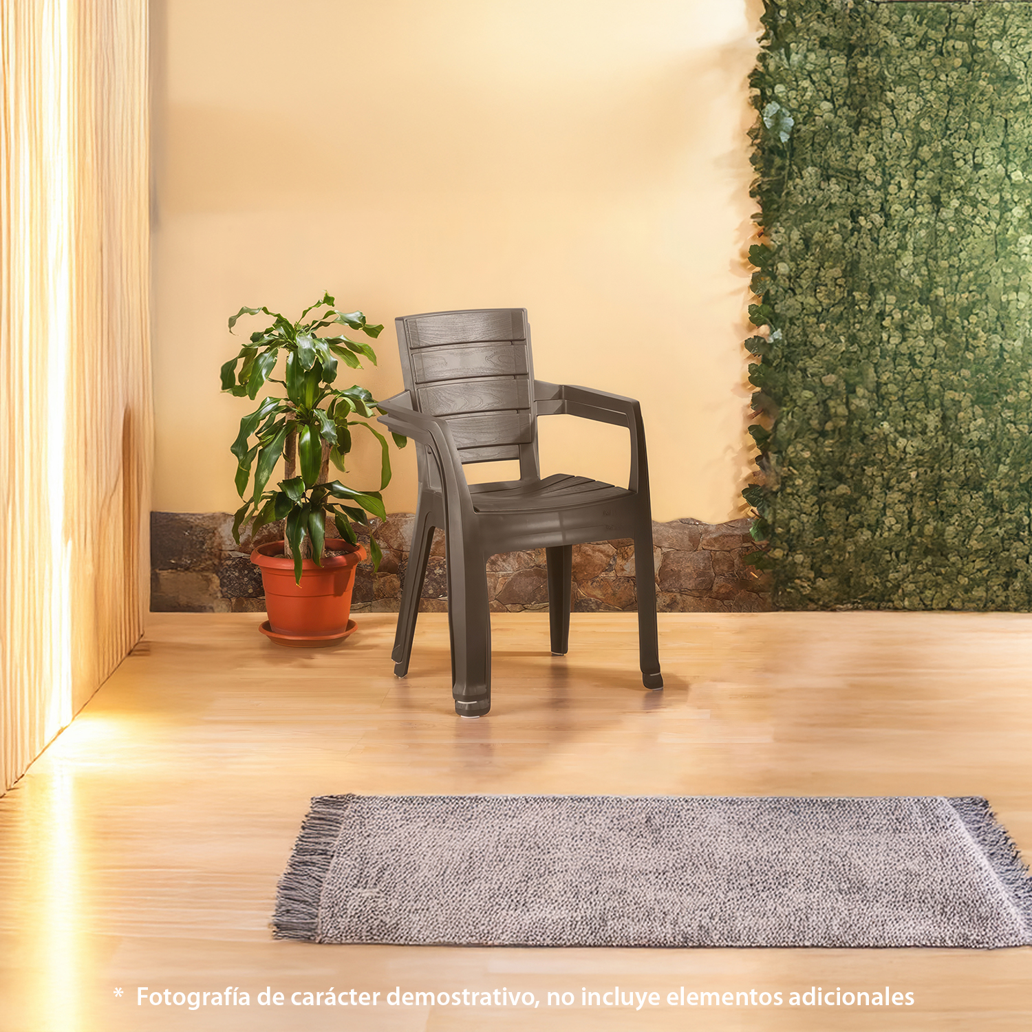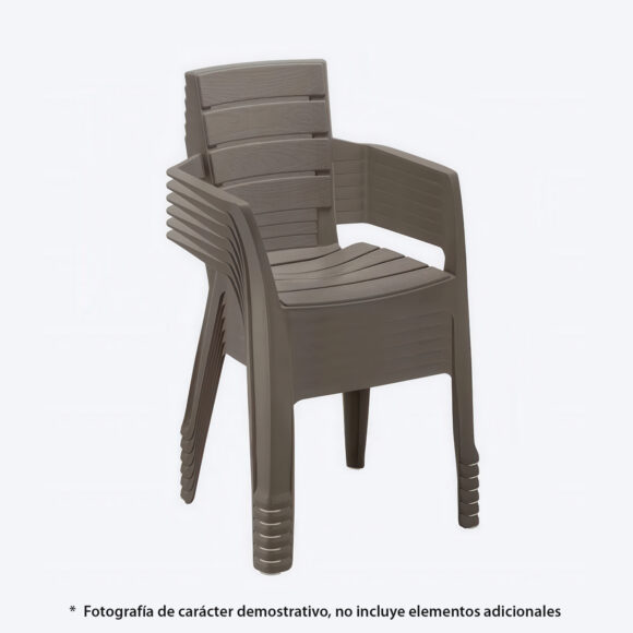 La Silla Rimax de apariencia madera es simple y elegante, inspirada en una textura natural que transmite tranquilidad, relajación y armonía, lo que la hace que sea el complemente ideal para el espacio de tu casa u oficina. La silla con brazos está fabricada en plástico, un material resistente al agua y que permite una mayor duración del producto, además soporta un peso máximo de hasta 115 kg.