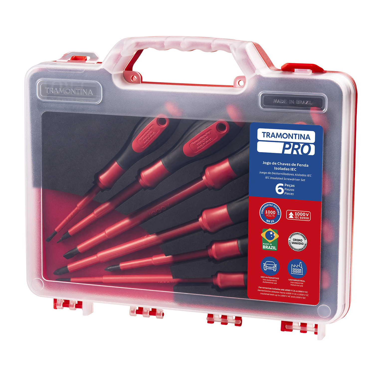 Puntas fosfatadas. Empuñadura con doble inyección. Aislamiento eléctrico de 1.000 V CA. Producto en conformidad con la IEC 60900. Indicadas para trabajos en baja tensión, hasta 1000 V en corriente alternada y 1500 V en corriente continua. Las herramientas aisladas Tramontina PRO son sometidas a diversos ensayos para atender a las normas IEC 60900: ensayo de impacto; ensayo deresistencia dielétrica; ensayo de adherencia del aislamiento; ensayo de inflamabilidad; ensayo de aislamiento eléctrico. Gama variada de herramientas para aplicación segura en áreas de trabajo con campos energéticos hasta 1.000 V. Utilizado por profesionales que trabajan en áreas de riesgo (redes energizadas e instalaciones industriales). Las herramientas son producidas y testadas bajo normas específicas. La IEC 60900 es una norma internacional que especifica requisitos para la fabricaciónyaprobación de herramientas aisladas. Equivalente a la norma europea EN 60900.