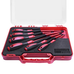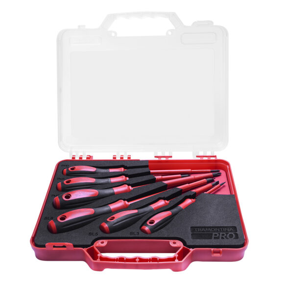 Contenido: 1 Destornillador aislado punta chata 3×75 mm – 1 Destornillador aislado punta chata 5×100 mm – Destornillador aislado punta chata 6×150 mm – Destornillador aislado punta cruzada Nr. 0 (3×150 mm) – Destornillador aislado punta cruzada Nr. 1 (5×100 mm) – Destornillador aislado punta cruzada Nr. 2 (6×150 mm) – 1 maletín plástico.